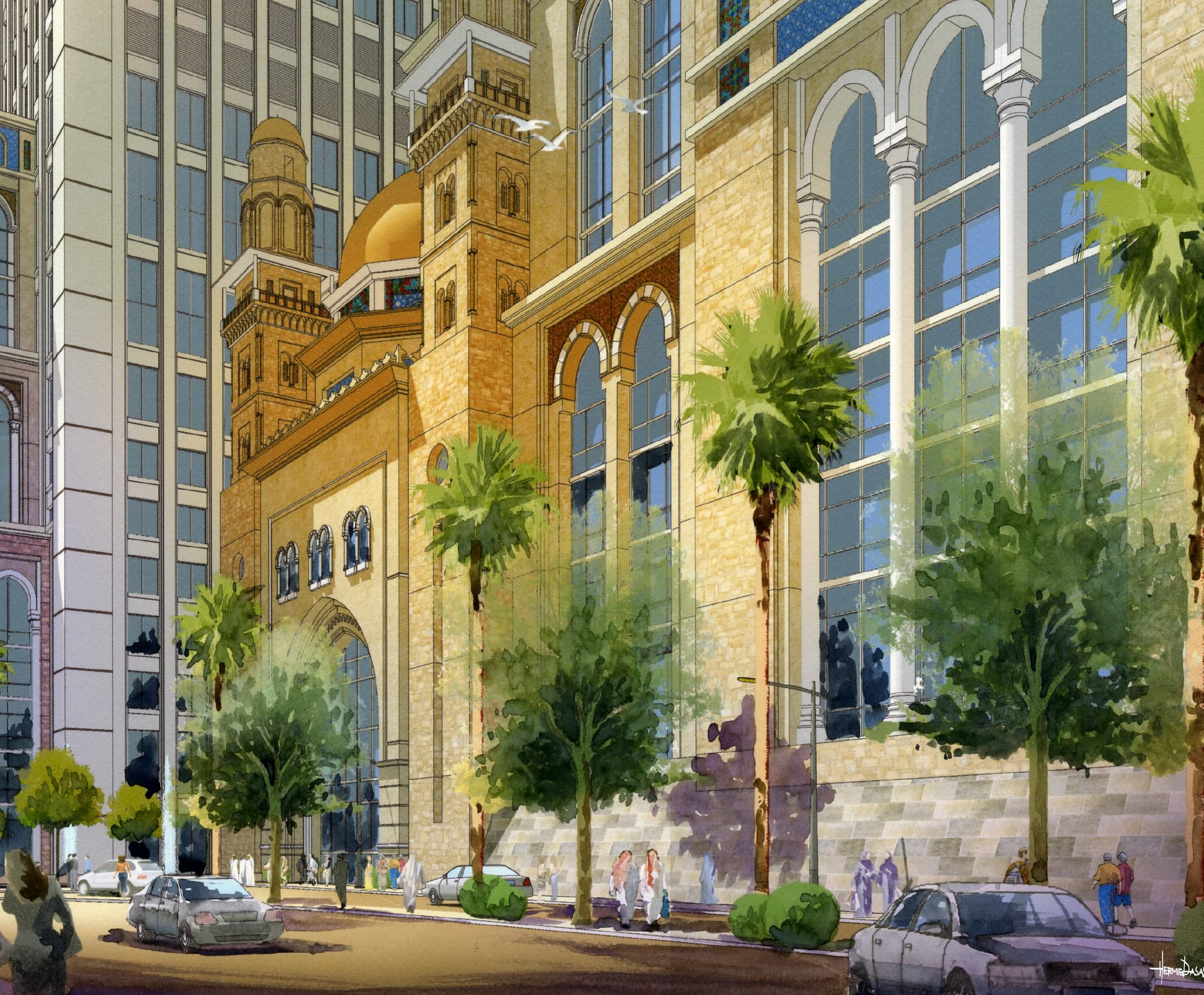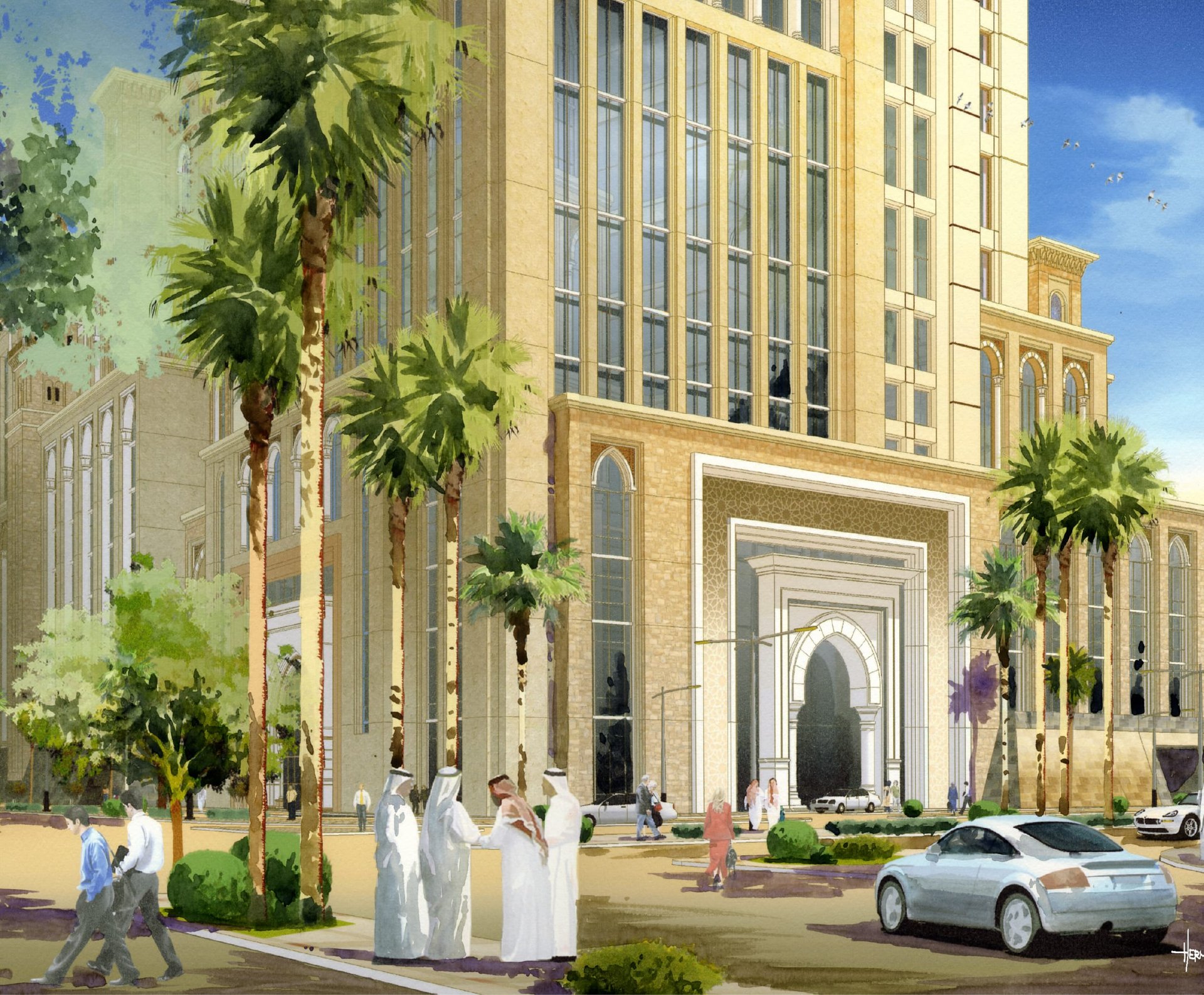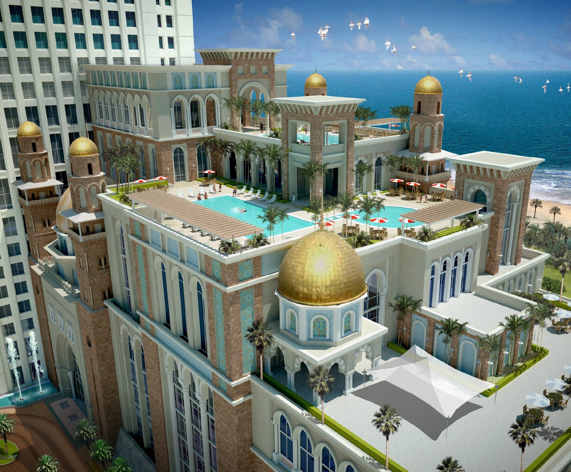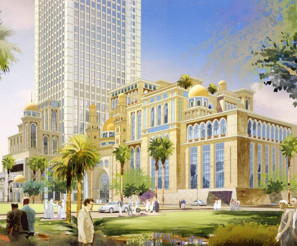 Soaring 100 stories above the city, this architectural masterpiece harmonizes contemporary luxury with cultural reverence. Inspired by the sacred Al-Aqsa Mosque's proportions, the tower elegantly houses three distinct hotels, premium office spaces, upscale retail, and serviced apartments within its shimmering facade. The design translates Islamic architectural principles into a soaring vertical community – where geometric patterns become structural elements, and spiritual motifs inform the soaring atrium spaces. More than a building, it's a bridge between eras, offering cutting-edge amenities while paying profound homage to regional heritage through every carefully considered detail and proportion.